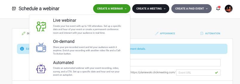 You’ll see a dropdown menu with several options. Select “On-demand webinar” from the list. This tells ClickMeeting you’re creating content people can access anytime, not a scheduled live event.