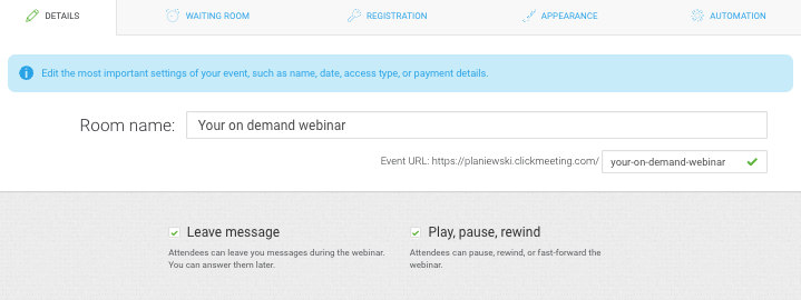Click “Done” and your on-demand webinar is live. ClickMeeting generates a unique URL you can share anywhere—in emails, on social media, embedded on your website, or included in online advertising.