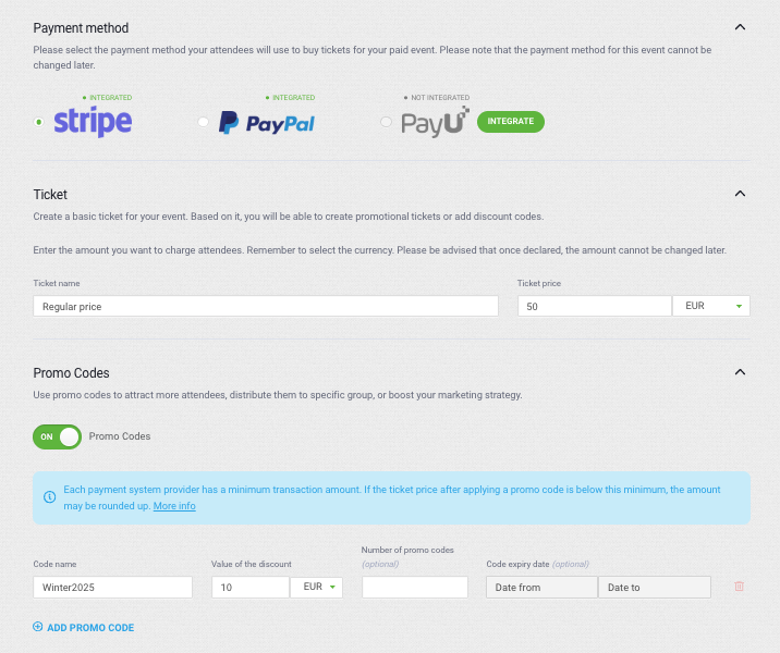 Once connected, ClickMeeting handles all payment processing automatically. Money goes directly to your payment processor account, minus the processor’s fees.