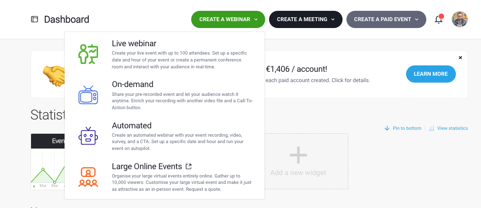 2. Click “Create a webinar” Choose your webinar type: live, automated, on-demand, or paid. Give it a name that clearly communicates the topic.
