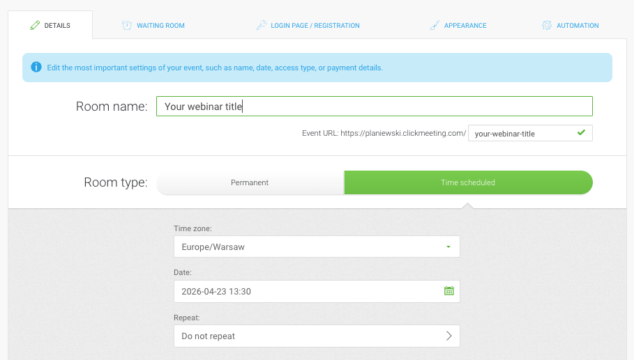 This format is ideal for recurring training, product demos, or educational content that stays relevant over time. You can run the same webinar every Monday and Thursday without showing up — and because ClickMeeting supports multiple simultaneous instances, two attendees in different time zones can join the same webinar at their local preferred time without any scheduling conflict.
