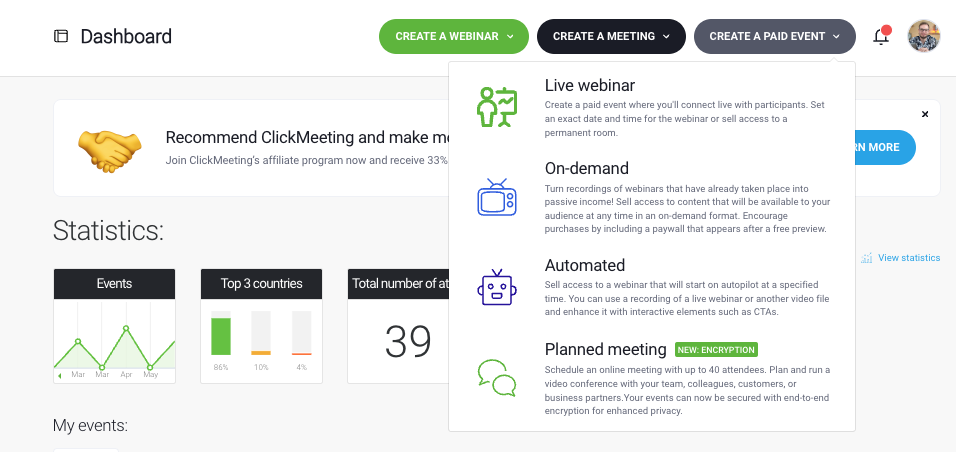 • There are five main webinar formats: live, automated, on-demand, paid, and lead gen — each serving a different business goal, and each easy to set up inside ClickMeeting.