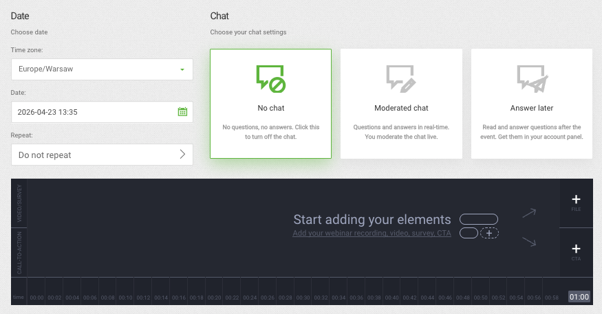 An automated webinar is a pre-recorded session that plays at a scheduled date and time without the host being present. You record the content once, upload it to ClickMeeting, and schedule it to run on any timetable you choose — the automated webinar timeline feature handles delivery, reminder emails, and post-event follow-up without any manual input from you. From the attendee’s perspective, it looks and feels like a live event: they register, receive reminders, join at the scheduled time, and can interact via chat.