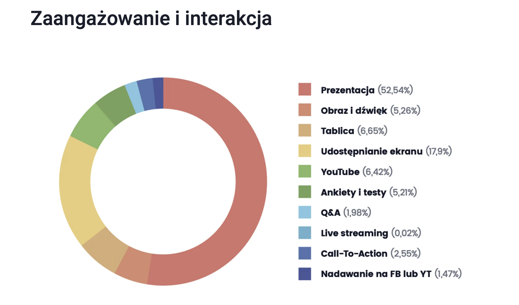 Organizatorzy preferują wykorzystywanie wszelkich form, które sprzyjają nadaniu webinarom dynamiki: prezentacja, użycie obrazów i dźwięku, tablicy czy udostępnianie ekranu. Część związana z kierowaniem bezpośredniej oferty do uczestników za pomocą przycisku Call-To-Action czy badania, jak ankiety, testy oraz sesje Q&A, nie jest jeszcze tak popularna.